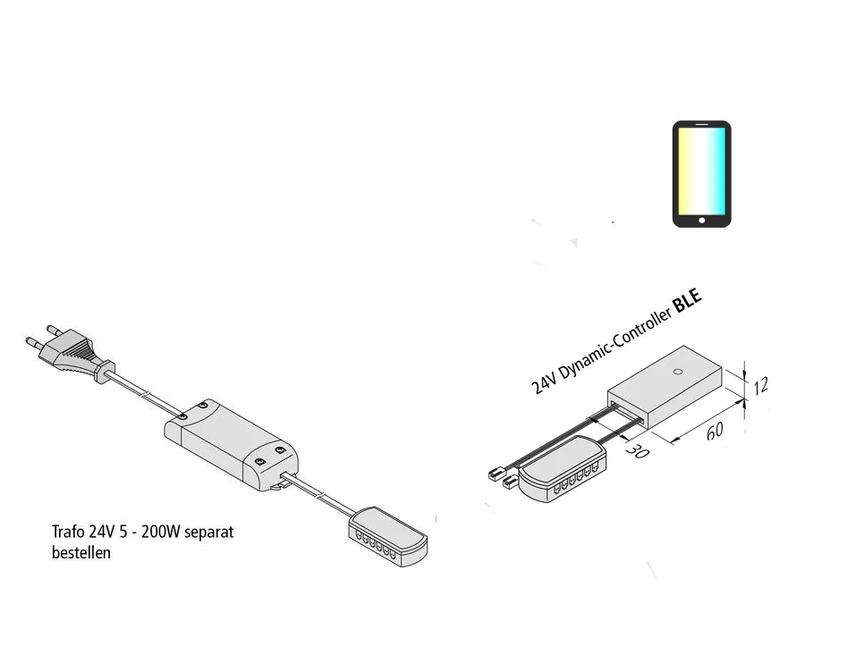 Bluetooth Low Energy-Controller zum Schalten und Steuern von 24V Dynamic Leuchten, steckerfertig und optional, für jede Neuinstallation oder nachträgliche Erweiterung des bestehenden Systems, ansteuerbar über jedes iOS oder Android Smartphone oder Tablet (mit kostenloser App), mit Memory-Funktion (nach Netztrennung wird der Zustand wieder hergestellt), Anschlussleitung mit zwei LED 24-Steckern und 12-fach Verteiler für die Leuchten